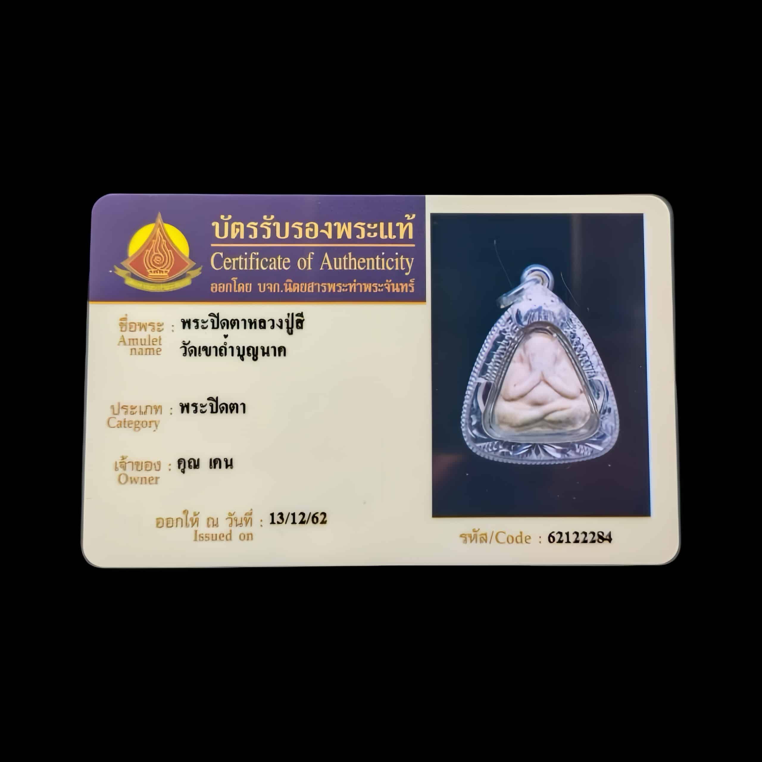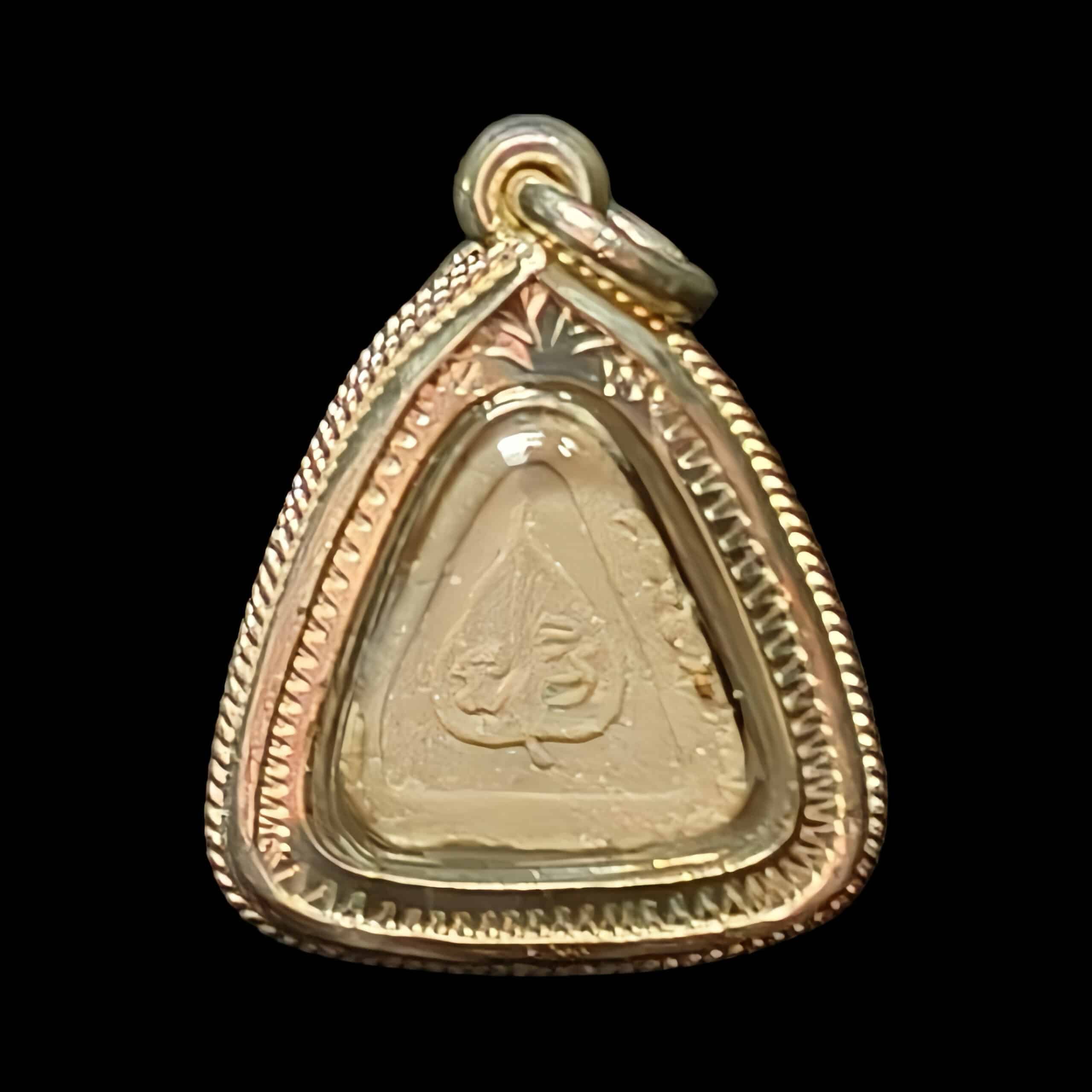 這面必達佛,牌背面為菩提葉造型,菩提葉內兩側有巴利符文”納”以及”咪”,這兩個符文也是這期必達佛名字由來。 此期必達總共出了7個款式,但是在龍婆喜的圖鑑收錄裡只列明6款,而佛牌主要材料是用了pong narai seegon,阿贊多用 來製作佛牌的四元素粉法門煉制的粉末,以及混合了108種草藥及粉來製作。